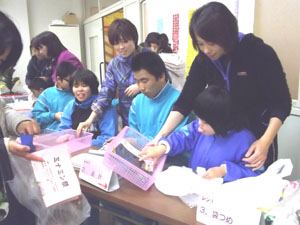 午後からは、中学部と高等部10作業種のバザーです。中学部は陶芸・農園芸・手工芸・紙工が小皿・焼き芋・豚汁・カレンダー等を、高等部は木工・布工・製菓・リサイクル・農園芸・総合サービスがコースター・クリスマスリース・野菜・ポップコーン等をそれぞれ販売しました。喫茶コーナーを開設した作業班や、調べ学習や体験の広場を設けた作業班もありました。また作品展示が随所に設けられ、授業で製作した作品を見ていただきました。多くの方のご来場、ありがとうございました。 |