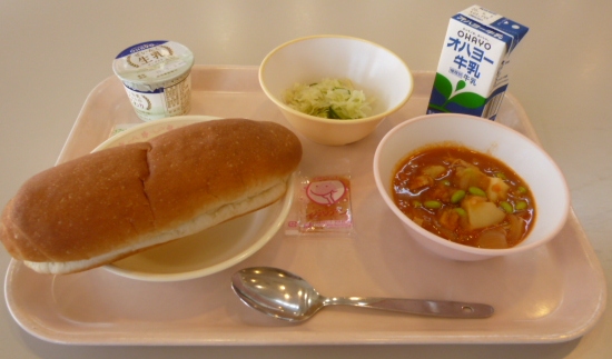 こめこパン、牛乳、ベーコンと野菜のトマト煮、キャベツのサラダ、ヨーグルト 711キロカロリー