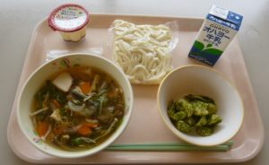 山菜うどん 牛乳 新じゃがのからあげ プリン 858キロカロリー