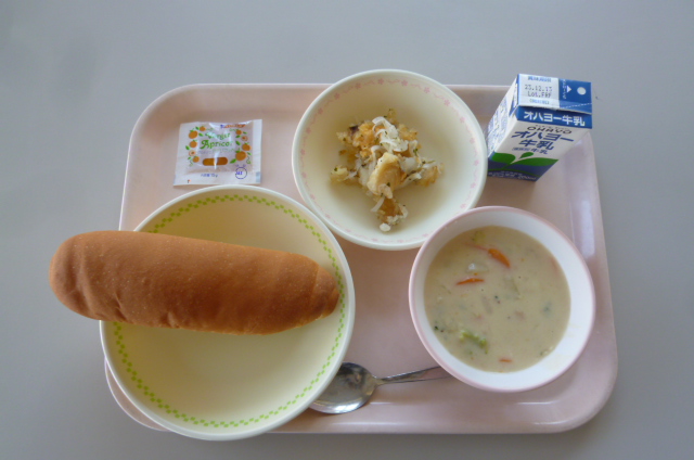 米粉パン 牛乳 白身魚のマリネ ほたてのチャウダー アプリコットジャム 824キロカロリー