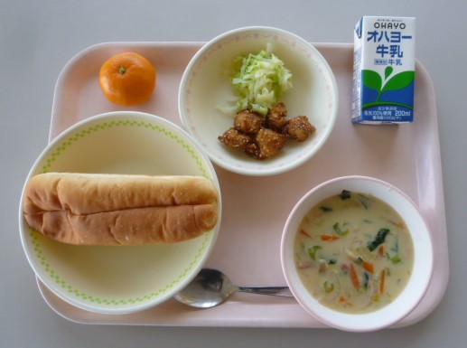 甘辛チキンバーガー(チキン・キャベツ) 牛乳 野菜と豆乳のスープ くだもの(みかん) 811キロカロリー