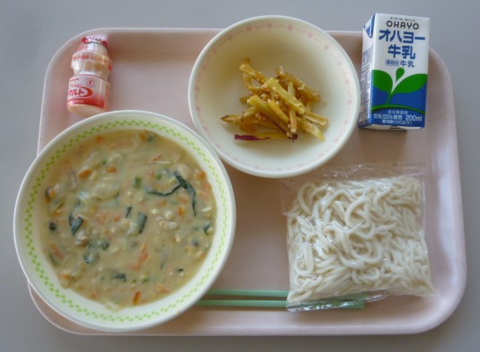 きのこスパゲティ 牛乳 いもかりんとう 857キロカロリー