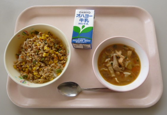 そぼろごはん 牛乳 さつま汁 811キロカロリー