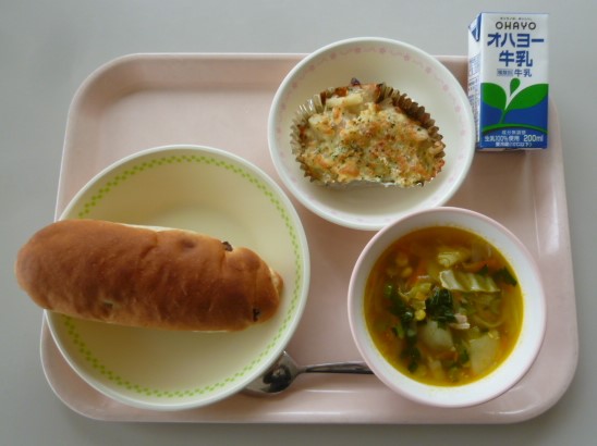 レーズンパン 牛乳 グラタン ベーコンスープ 841キロカロリー