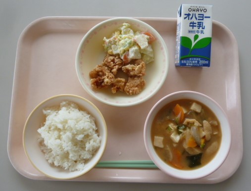 ごはん 牛乳 若どりのから揚げ ポテトサラダ みそ汁 827キロカロリー