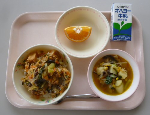 豚キムチ丼 牛乳 ワンタンスープ くだもの(いよかん) 836キロカロリー