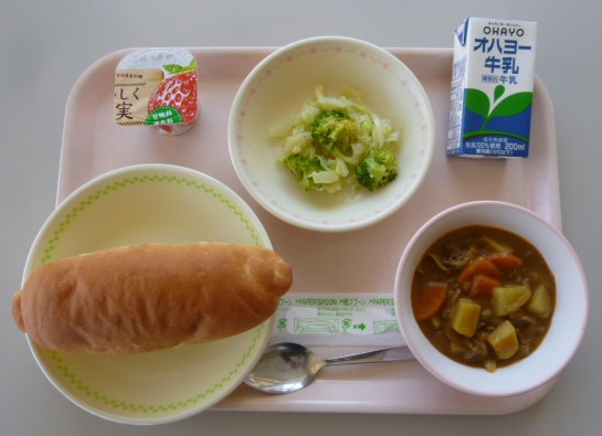米粉パン 牛乳 カレーシチュー レモンサラダ いちごヨーグルト 824キロカロリー