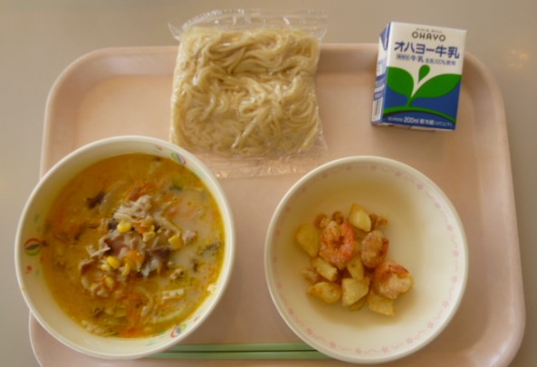 塩ラーメン 牛乳 えびとじゃがいものから揚げ 841キロカロリー