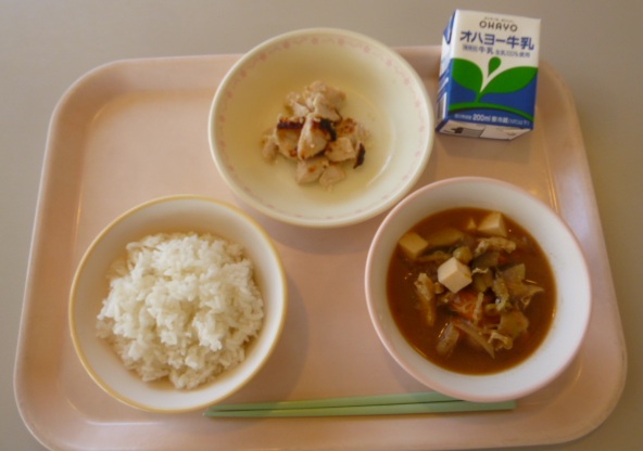 ごはん 牛乳 若どりの塩こうじ焼き 秋なすのみそ汁 734キロカロリー