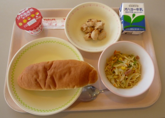 米粉パン 牛乳 若どりのマーマレード焼き スパゲティソテー(バジル風味)
