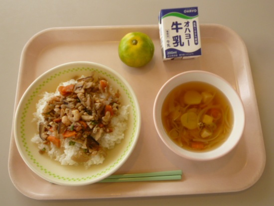 岡山ずし 牛乳 ちらしかまぼこ入りすまし汁 くだもの(みかん) 687キロカロリー