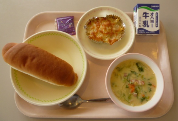 米粉パン 牛乳 グラタン 野菜と豆乳のスープ ブルーベリージャム 853キロカロリー