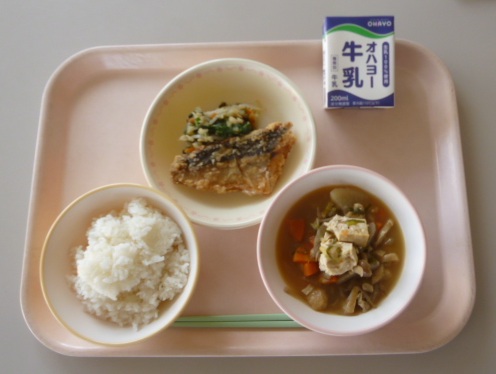 ごはん 牛乳 さばの竜田揚げ こまつなのからしあえ けんちん汁 839キロカロリー