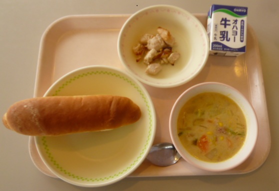 米粉パン 牛乳 若どりのマーマレード焼き 豆乳スープ 706キロカロリー