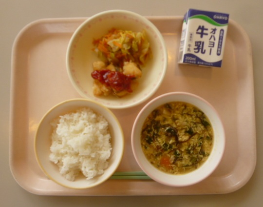 ごはん 牛乳 白身魚のチリソースかけ もずくスープ 中華炒め 812キロカロリー