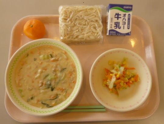クリームスープスパゲティ 牛乳 白菜サラダ くだもの(みかん) 735キロカロリー