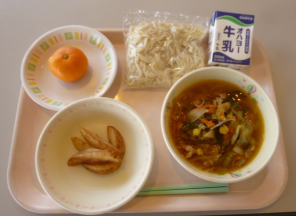 しょうゆラーメン 牛乳 フライドポテト くだもの(みかん) 752キロカロリー