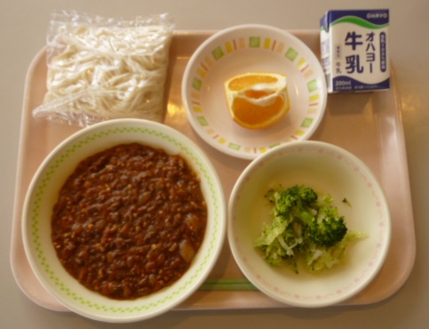 ミートソースめん 牛乳 ブロッコリーサラダ くだもの(いよかん) 818キロカロリー