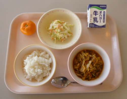 豚キムチ丼 牛乳 ポテトサラダ くだもの(みかん) 696キロカロリー