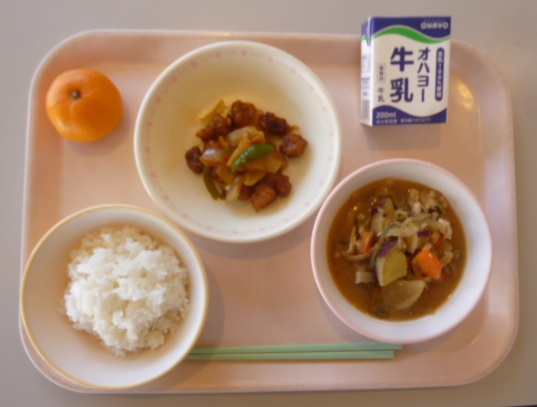 ごはん 牛乳 豚肉の甘酢いため さつま汁 くだもの(みかん) 825キロカロリー