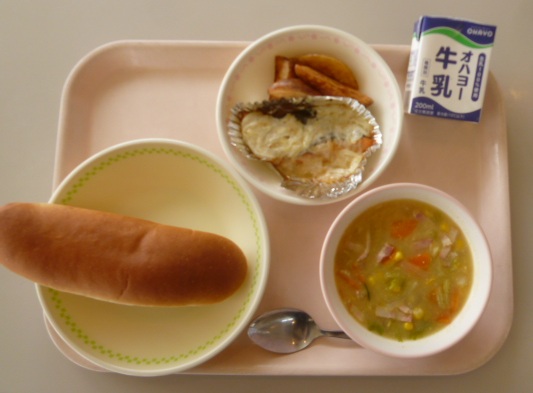 米粉パン 牛乳 鮭のマヨネーズ焼き フライドポテト レタスとコーンのスープ 864キロカロリー