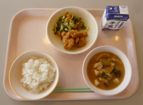 ごはん 牛乳 若どりの甘辛 茎わかめの酢のもの さつまいものみそ汁 878キロカロリー