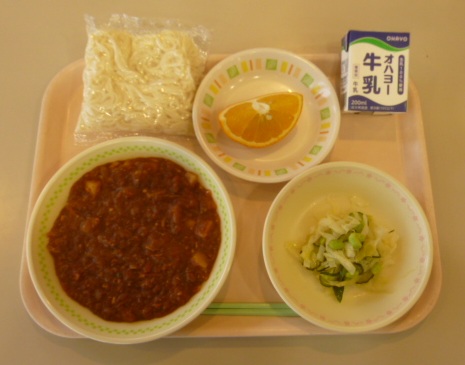ミートソースめん 牛乳 グリーンサラダ くだもの(あまなつかん) 841キロカロリー